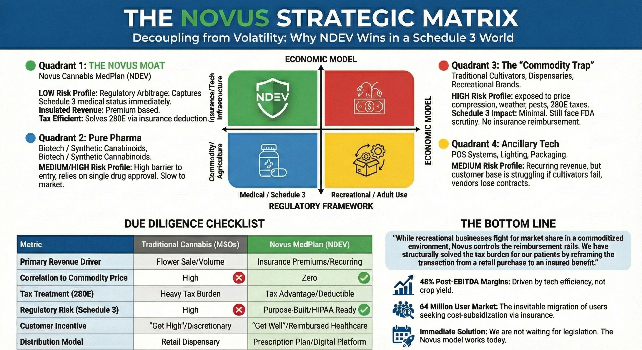 Consider the immense market potential: 64 million medical and recreational cannabis users could be interested in a prescription drug plan that incorporates cannabis coverage. We have structurally solved the tax burden for our patients by reframing the transaction. This is a game-changer that creates value today. Please review below the Novus Matrix and Quadrant Chart for a one-page explanation of our due diligence and competitive landscape. We are confident in our direction and thank you for your continued partnership.