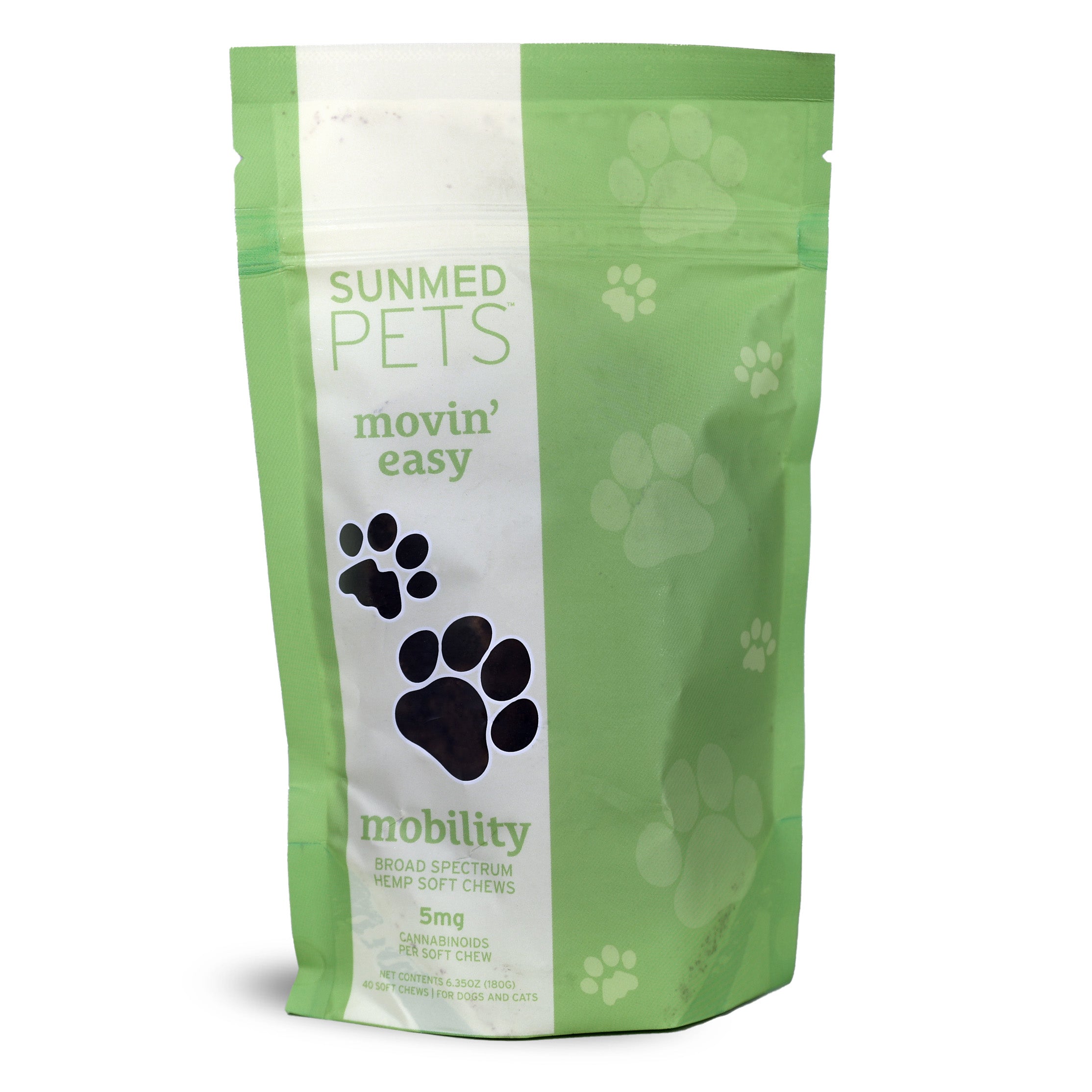 Sunmed CBD Broad Spectrum Movin’ Easy Relief CBD Pet Chews pouch features paw prints and product details, offering broad spectrum hemp extract to support pet relief and mobility.