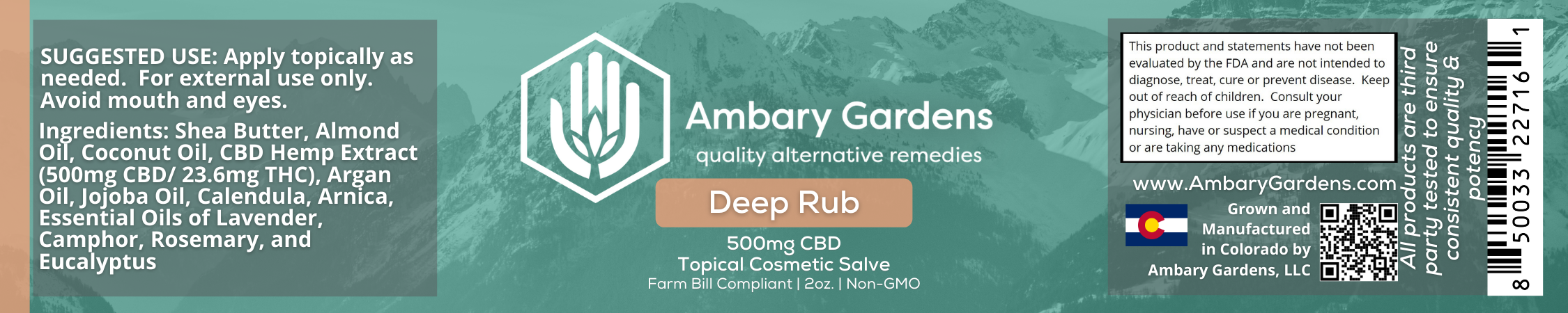 Our Deep Rub is our deepest penetrating, most concentrated CBD infused shea butter salve providing soothing relief for sore joints. With twice the CBD content as our Muscle Recovery salve, this is a favorite for people suffering from arthritis and joint pain.